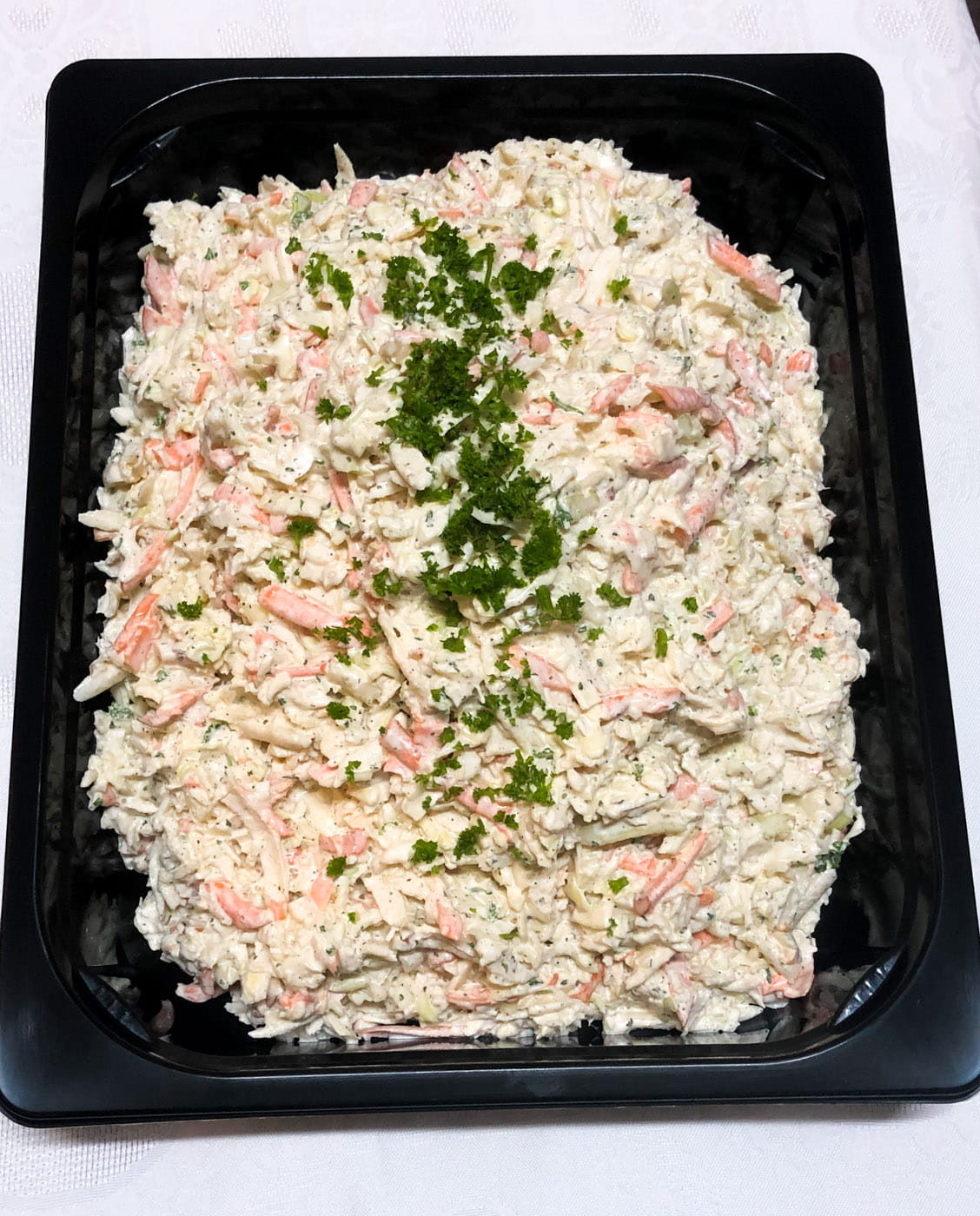 SKŁADNIKI:kapusta biała, marchew, majonez (olej roślinny rzepakowy(63%),woda, żółtko jaj(3,9%),ocet spirytusowy, musztarda( woda, ocet spirytusowy, gorczyca, cukier, sól), cukier, skrobia modyfikowana, sól, substancje zagęszczające: guma guar, guma ksantowa, przeciwutleniacz: E 385, barwnik: karoteny), natka pietruszki, ocet, sól, pieprz czarny, cukier.